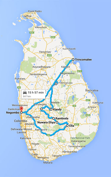 Destinations : Negombo / Sigiriya / Dambulla / Trincomalee / Polonnaruwa / Kandy / Gurupotha / Sitakotuwa / Weragantota / Pinnawala / Hanuman Kovil / Ramboda / Nuwara Eliya / Gawagala / Divrumpola / Ella / Negombo
